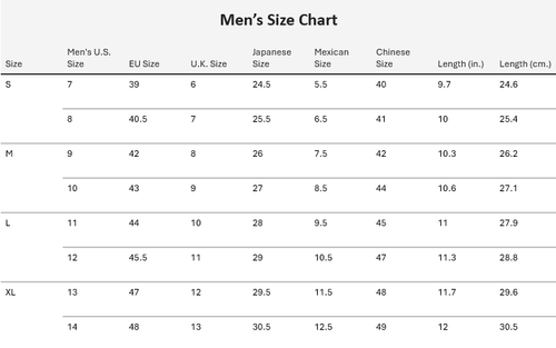 Men's: Size Small (7-8), Medium (9-10), Large (11-12), X-Large (13-14)