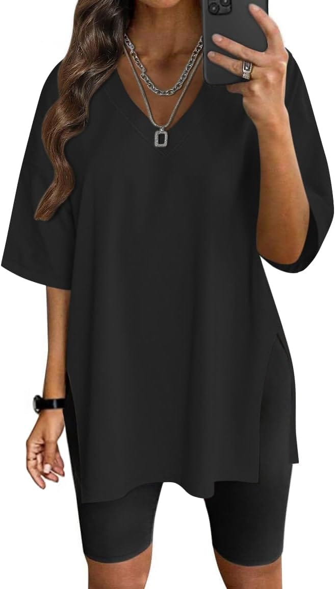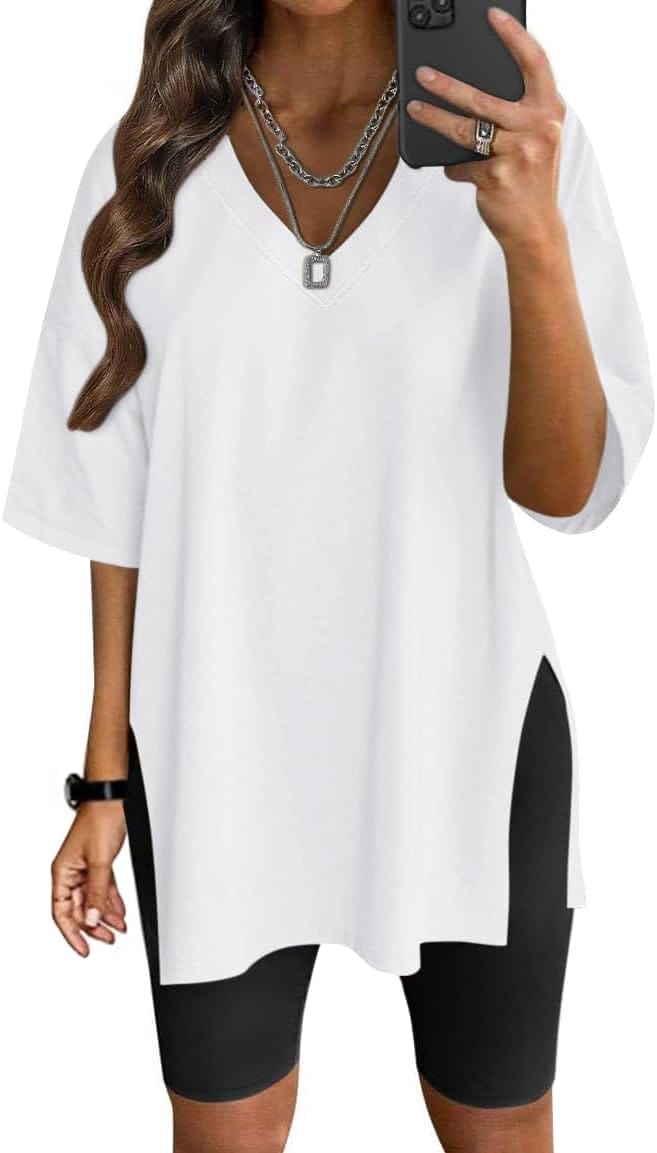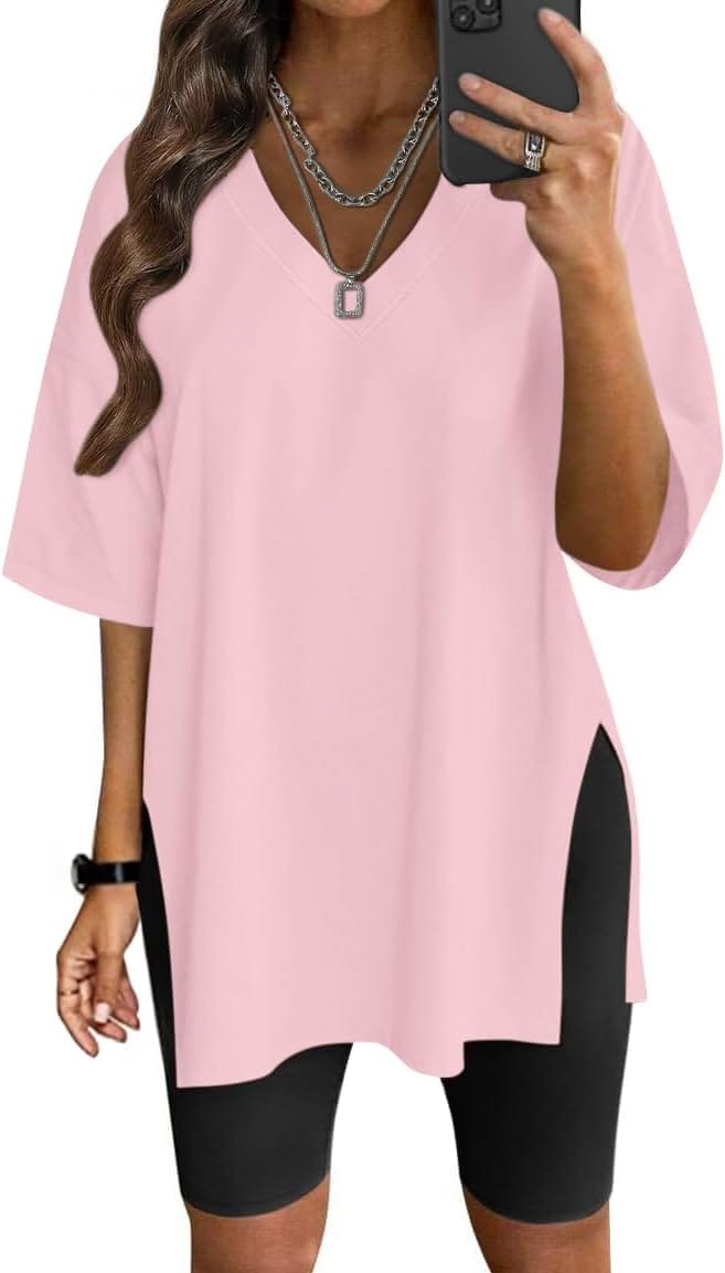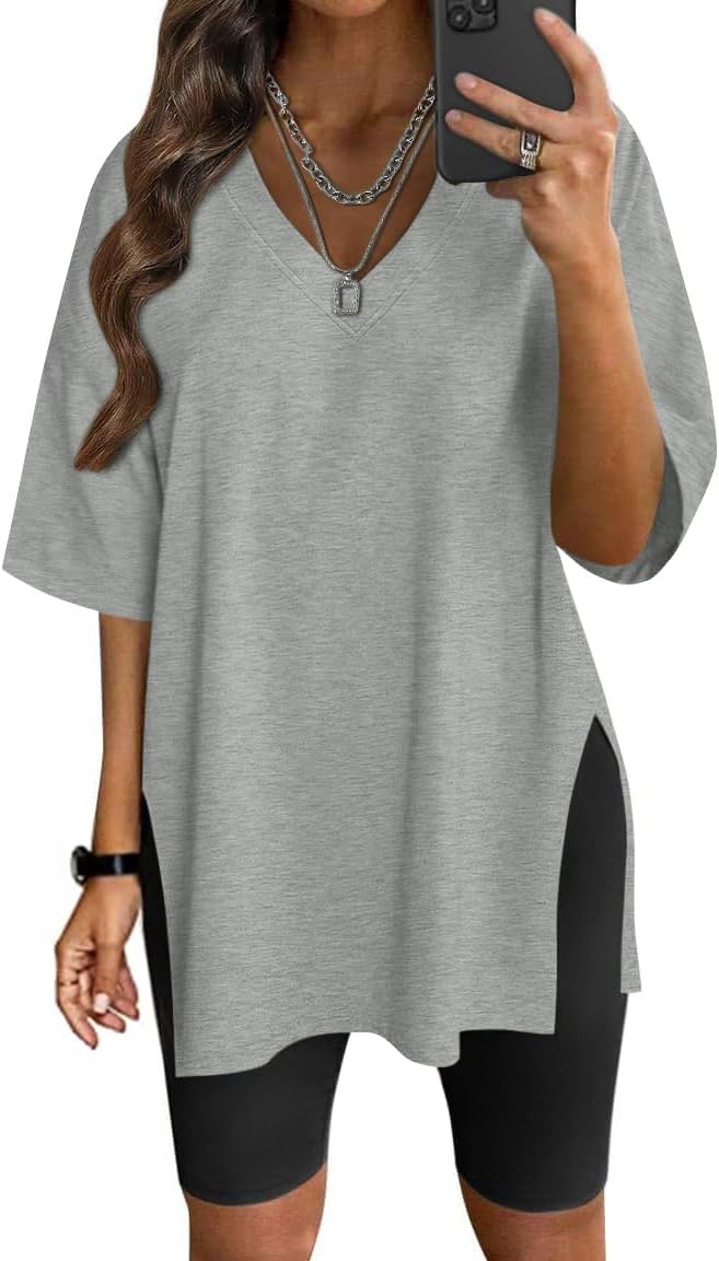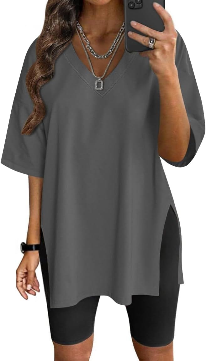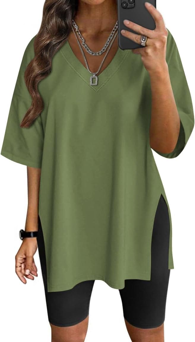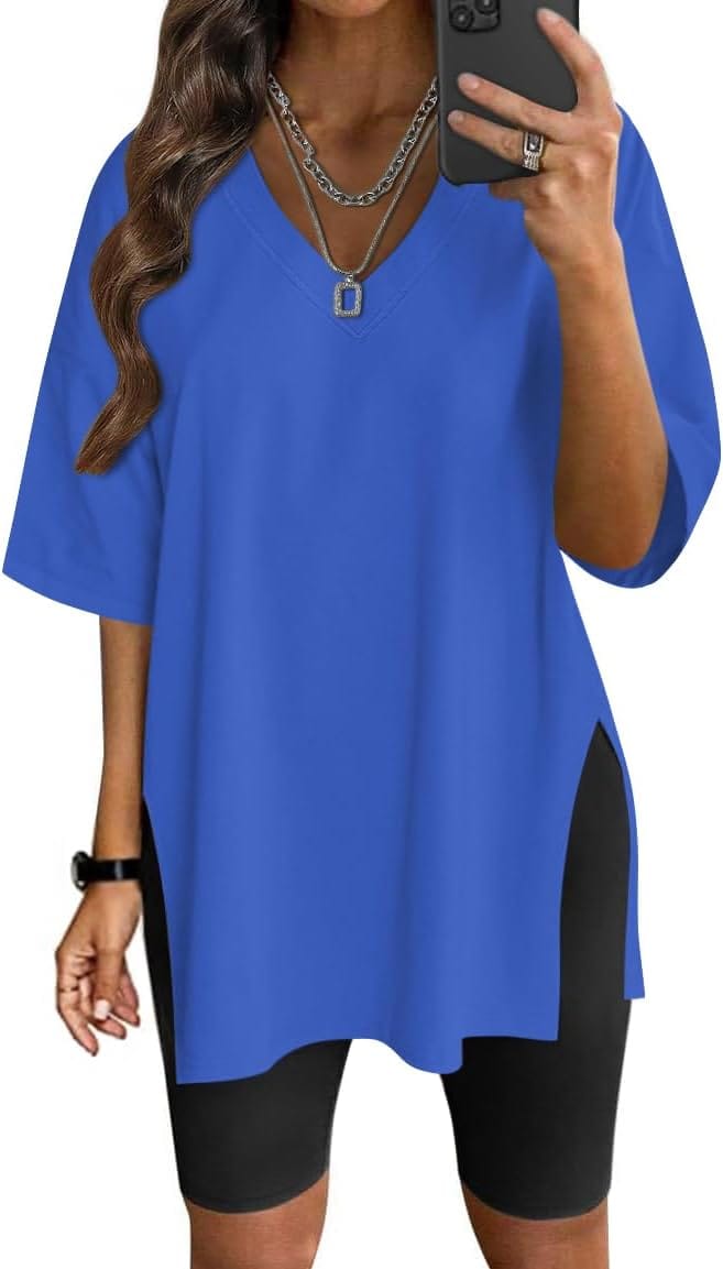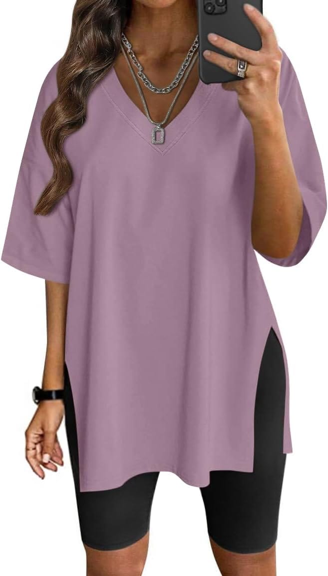 • 【UNIQUE DESIGN】: Womens oversized t shirts, deep v neck, drop shoulder, side split, plus size, loose fit, short sleeve, classic plain t-shirt, basic tee, tunic tops, casual, simple and sports, show your charm to everyone.